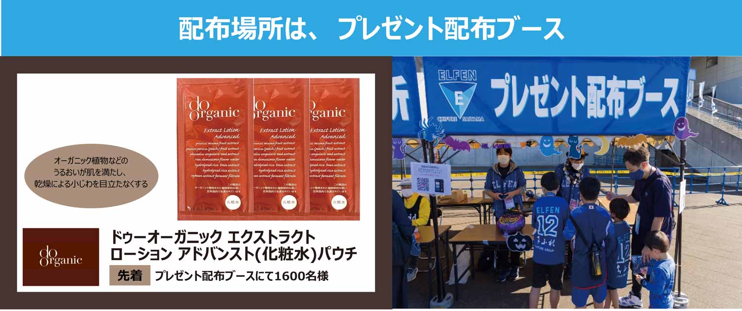 当日配布されます「マッチデイプログラム」にあるQRコードより、ご応募いただける、来場者限定プレゼントです。今回のプレゼントは、マッチスポンサーちふれグループのドゥーオーガニックより、ドゥーオーガニック エクストラスト ローション アドバンス(化粧水)現品を20名様にプレゼント!